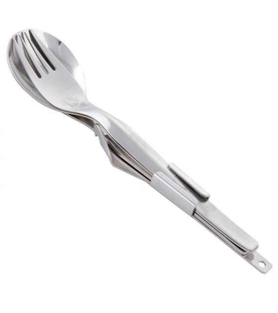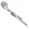 Turistický príbor. Lyžica, vidlička, nôž a otvárač na konzervy.