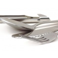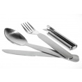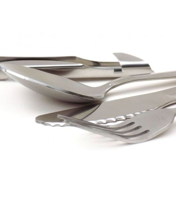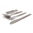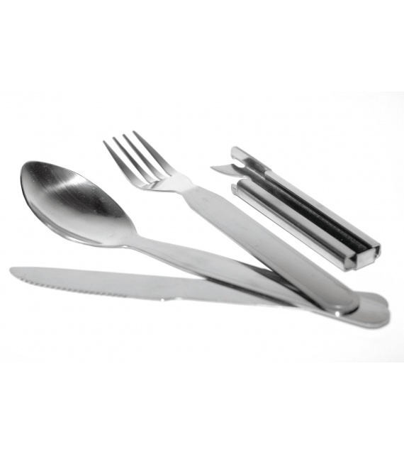 Štvordielná turistická sada príborov obsahujúca kombinovaný otvárak na konzervy a fľaše, do ktorého je možné vložiť lyžicu, vidličku a nôž.