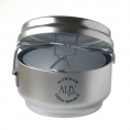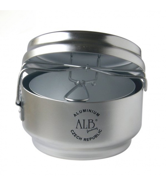 Klasický trojdielny hliníkový obedár („ešus“) - dve nádoba a jedna pokrývka alebo panvička, sklopné držadlo. Klasický, generáciami preverený riad.